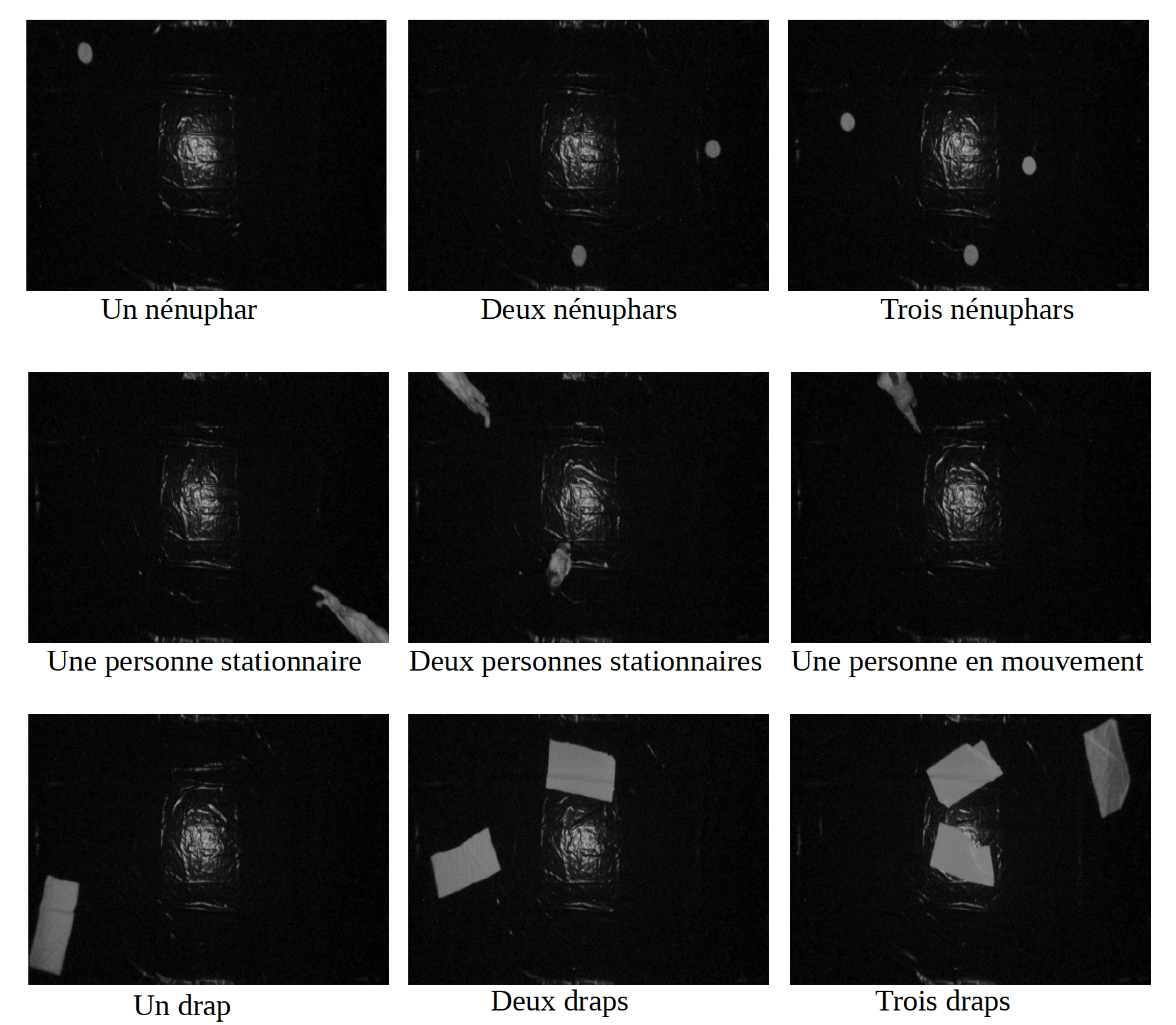 Les résultats attendus consistent essentiellement en la conception de l’algorithme d’IA permettant d’extraire à partir des images issues d’une caméra infrarouge les zones contenant des corps humains, des disques de tissu ou des draps, ce afin de permettre à la compagnie de théâtre de réaliser le mapping vidéo en ciblant chaque individu et chaque objet de manière différenciée et spécifique pour créer une expérience visuelle unique destinée aux spectateurs de la performance. Laurent a fait des tests en situation réelle : la troupe a décidé d’utiliser des tissus blancs rectangulaires de 150x50cm (draps) ainsi que des tissus blancs circulaires (nénuphars) de 20cm de rayon afin de projeter des images dessus. Les formes à détecter seront donc ces draps et nénuphars ainsi que les personnes sur la scène. L’avant-dernier jour de la résidence, nous avons organisé une séance photo pour capturer des exemples de cas possibles mêlant les draps, les nénuphars et les personnes.