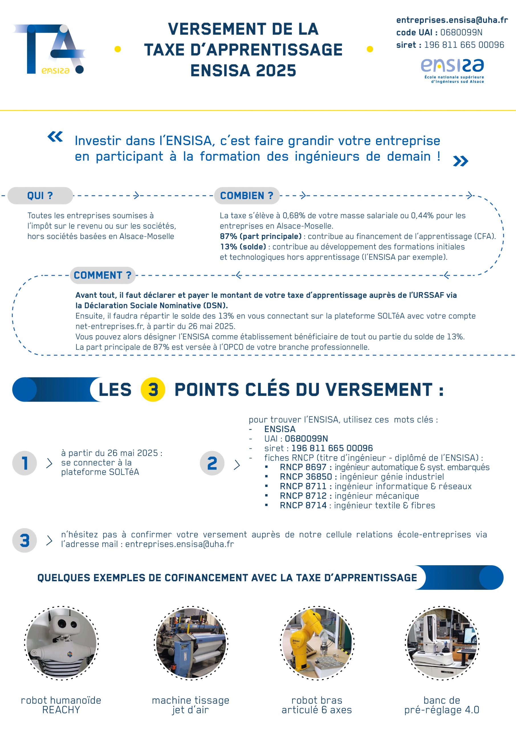 N’hésitez pas à confirmer auprès de l’ENSISA, votre versement de la taxe d’apprentissage !